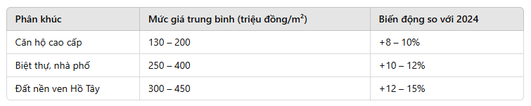 Dưới đây là mức giá trung bình (tham khảo) của một số phân khúc tại Tây Hồ trong quý 1/2025: